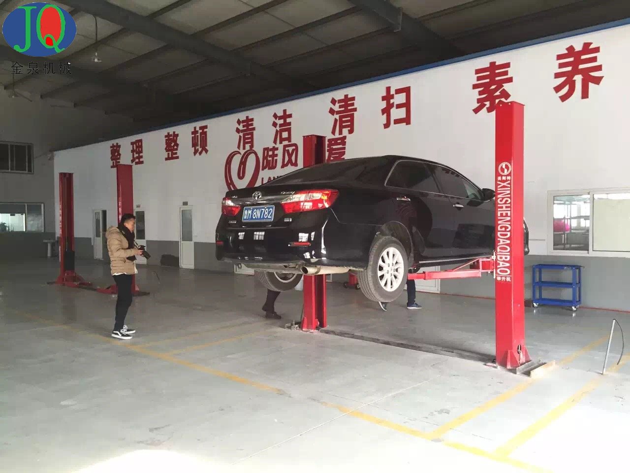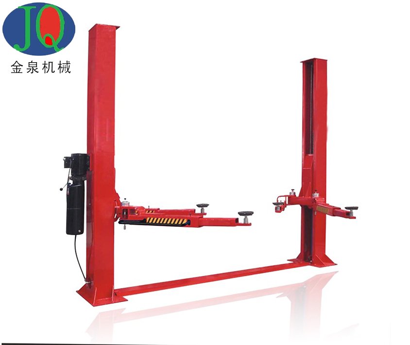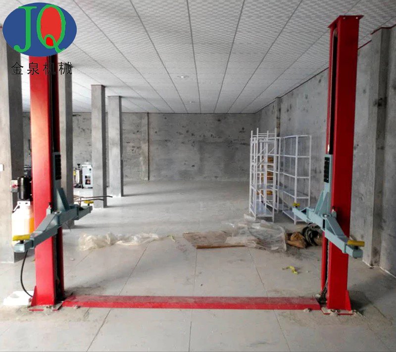 雙柱式汽車舉升機(jī)是一種汽車修理和保養(yǎng)單位常用的專用機(jī)械舉升設(shè)備,廣泛應(yīng)用于轎車等小型車的維修和保養(yǎng)。雙柱式汽車舉升機(jī)將汽車舉升在空中的同時(shí)可以節(jié)省大量的地面空間,方便地面作業(yè)。但是雙柱式汽車舉升機(jī)為了最大的節(jié)省材料,一般都去掉了底板。由于沒有底板,使得立柱的扭力需要靠地面來抵消,所以對(duì)地基要求很高,若是有橫梁(龍門舉升機(jī))就靠橫梁抵消。