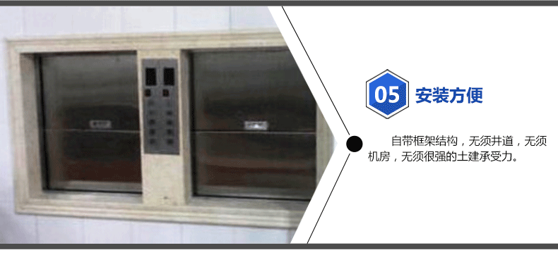 5.安裝方便:自帶框架結(jié)構(gòu),無須井道,無須機(jī)房,無須很強(qiáng)的土建承受力。